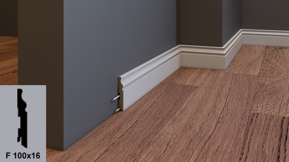Фигурный плинтус в эмали сочетает декоративность и практичность. Выразительный профиль подчёркивает стиль интерьера, позволяет устанавливать его с разными типами напольных покрытий — от паркетной доски и ламината до натурального камня или плитки.