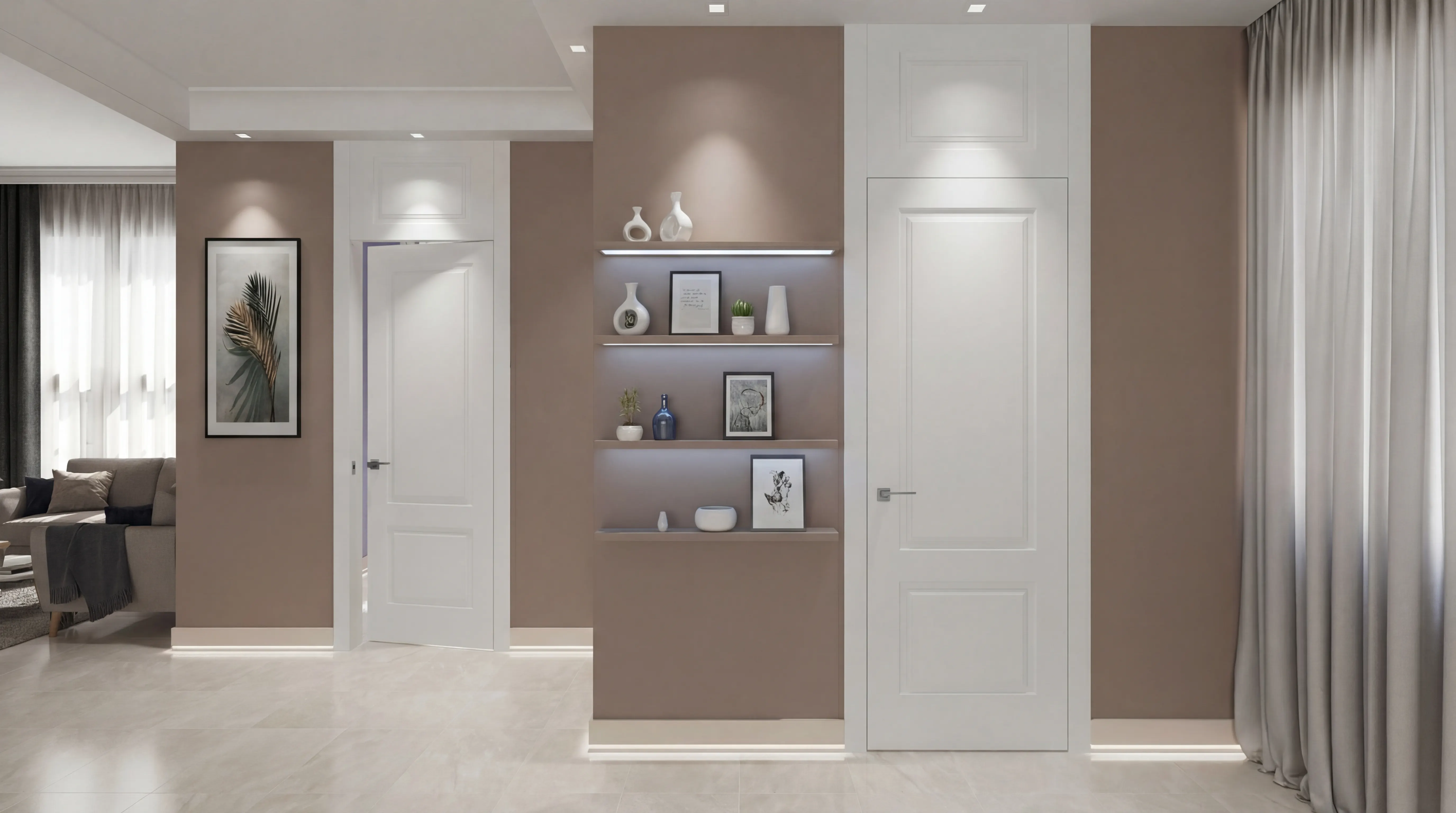 Раздвижные двери с невидимыми механизмами, обеспечивающие плавное и тихое открывание.
