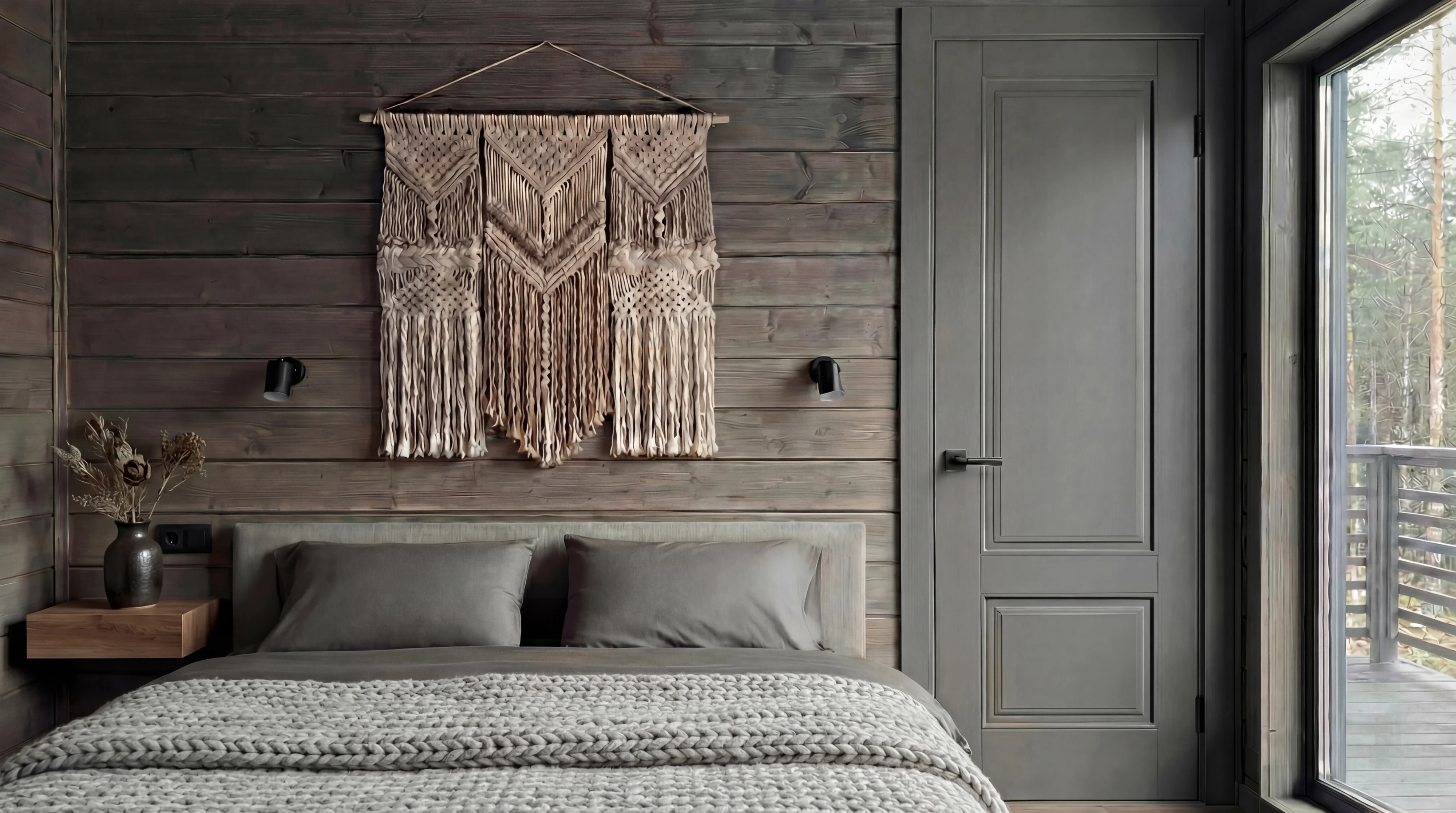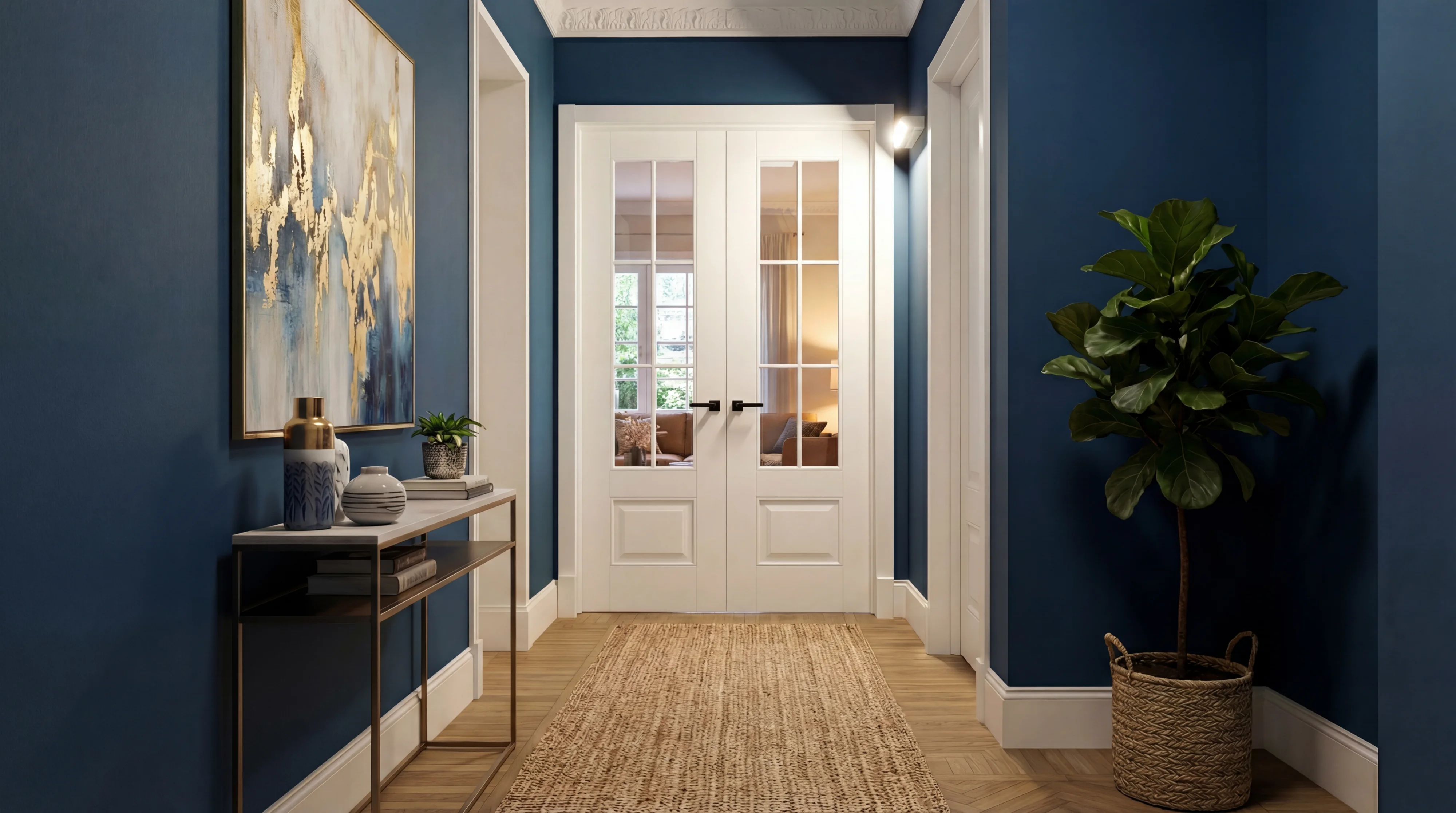 Стеновые панели буазери придают интерьеру изысканность: они изящно обрамляют дверь по периметру и распространяют её стилистику на прилегающую стену, обеспечивая единство дизайна и создавая выразительное, гармоничное пространство.